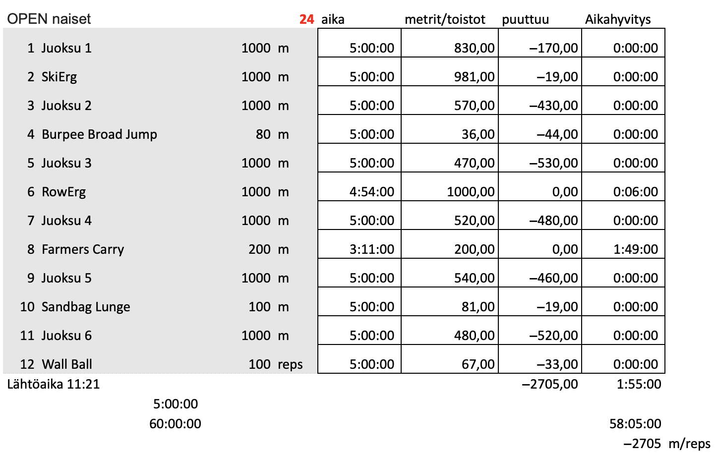 Kilpailija 24 – 58:05:00 / -2705 m/reps